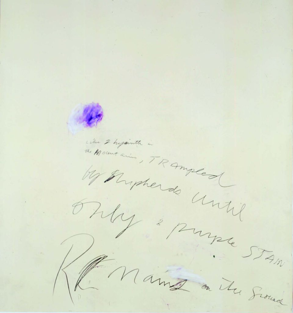 Van Cy Twombly hebben mensen met verstand van zaken wel beweerd dat zijn handschrift – het handschrift waarmee hij zijn schilderijen signeerde, betitelde, bekladde en van terloopse notities en commentaren voorzag – het handschrift van een demente bejaarde is. En inderdaad: Twombly’s handschrift is het absolute tegendeel van beheerste calligrafie. Zijn klaarblijkelijke onvermogen om een fatsoenlijke penseelstreek of potloodlijn op het doek te zetten is het tegenovergestelde van virtuositeit.
